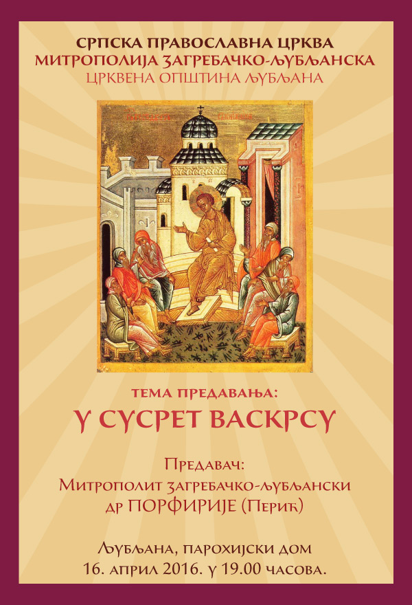 Његово Високопреосвештенство Митрополит загребачко-љубљански др Порфирије одржаће, у суботу 16. априла, у Парохијском дому у Љубљани, предавање у оквиру Љубљанских духовних вечери, са темом "У сусрет Васкрсу".