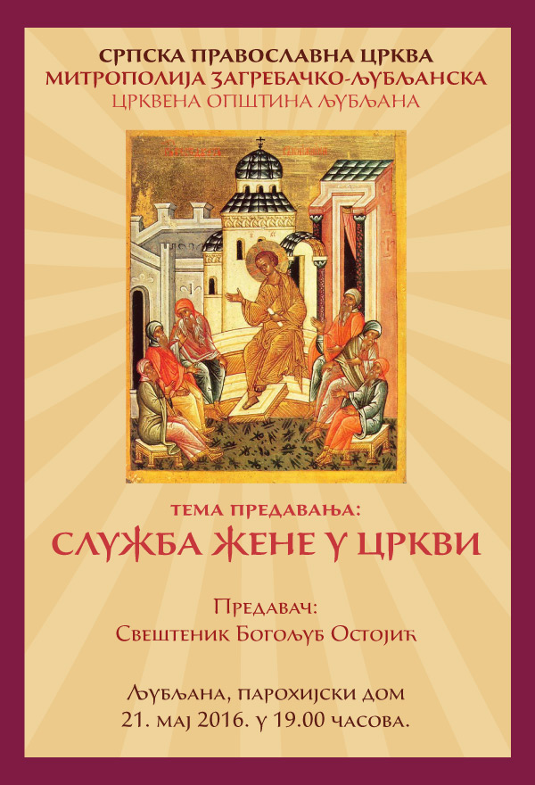 Циклус предавања "Љубљанске духовне вечери", у Парохијском дому у Љубљани, наставља се у суботу, 21. маја, с почетком у 19.00 часова, када ће на тему "Служба жене у Цркви" говорити парох загребачки презвитер Богољуб Остојић.